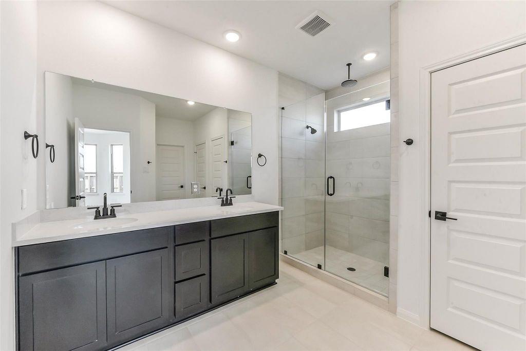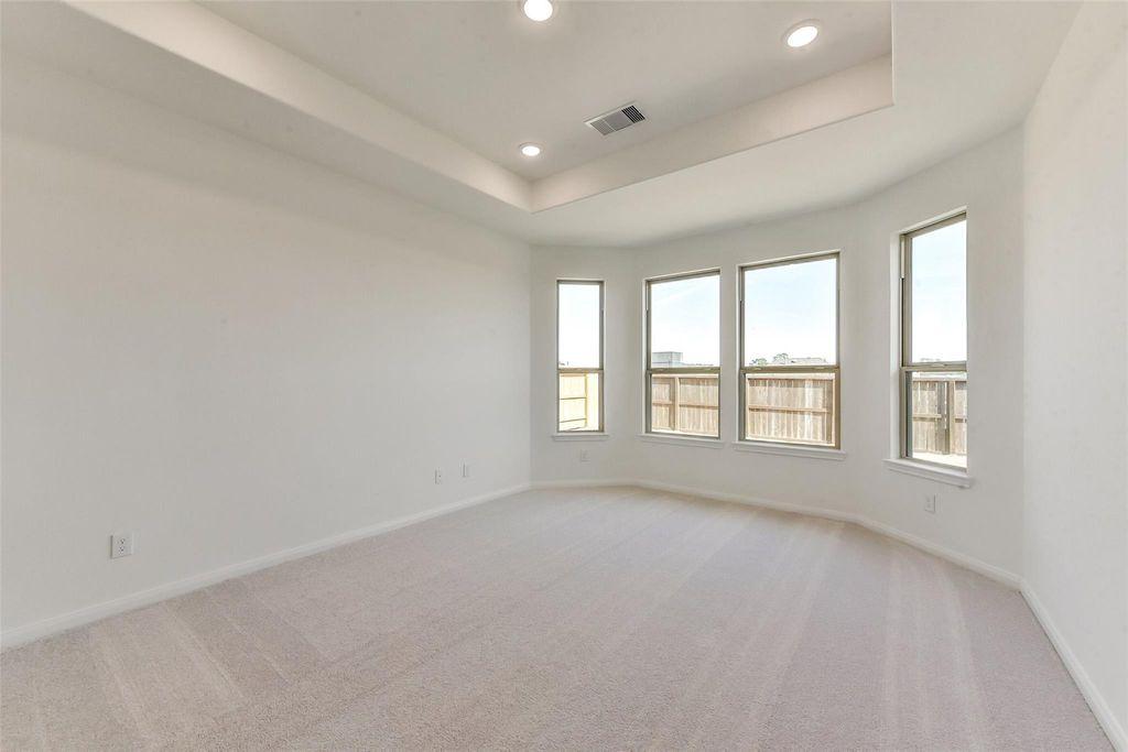 The primary suite includes a bay window and a luxurious bath with separate tub and shower. Additional highlights include wrought iron stair spindles, full sprinkler system with fully sodded yard, 3-sided brick exterior, 2” designer Capri blinds, Wi-Fi garage door opener, tankless water heater, and 30-year composite shingles.